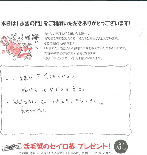 氷雪の門では、ご来店いただいたお客様に「しあわせメッセージ」と称して、お店で感じた「しあわせ」を綴っていただいております。 お客様の幸せは私たちの活力、ここではその一部をご紹介いたします!ご来店の際にはぜひ「しあわせメッセージ」をお願いいたします。