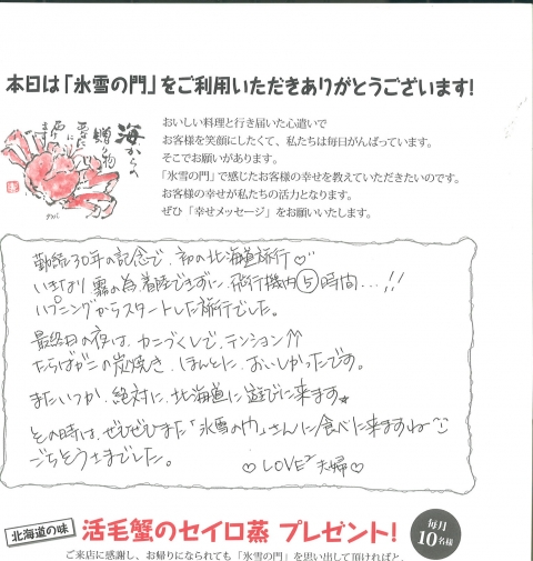 氷雪の門では、ご来店いただいたお客様に「しあわせメッセージ」と称して、お店で感じた「しあわせ」を綴っていただいております。 お客様の幸せは私たちの活力、ここではその一部をご紹介いたします!ご来店の際にはぜひ「しあわせメッセージ」をお願いいたします。