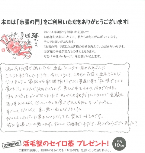氷雪の門では、ご来店いただいたお客様に「しあわせメッセージ」と称して、お店で感じた「しあわせ」を綴っていただいております。 お客様の幸せは私たちの活力、ここではその一部をご紹介いたします!ご来店の際にはぜひ「しあわせメッセージ」をお願いいたします。