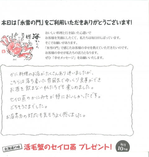 氷雪の門では、ご来店いただいたお客様に「しあわせメッセージ」と称して、お店で感じた「しあわせ」を綴っていただいております。 お客様の幸せは私たちの活力、ここではその一部をご紹介いたします!ご来店の際にはぜひ「しあわせメッセージ」をお願いいたします。