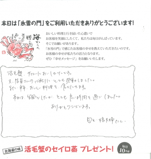 氷雪の門では、ご来店いただいたお客様に「しあわせメッセージ」と称して、お店で感じた「しあわせ」を綴っていただいております。 お客様の幸せは私たちの活力、ここではその一部をご紹介いたします!ご来店の際にはぜひ「しあわせメッセージ」をお願いいたします。