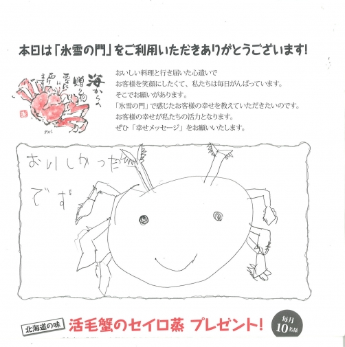 氷雪の門では、ご来店いただいたお客様に「しあわせメッセージ」と称して、お店で感じた「しあわせ」を綴っていただいております。 お客様の幸せは私たちの活力、ここではその一部をご紹介いたします!ご来店の際にはぜひ「しあわせメッセージ」をお願いいたします。