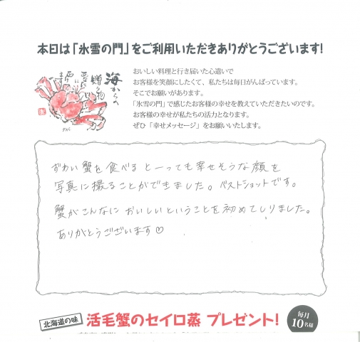 氷雪の門では、ご来店いただいたお客様に「しあわせメッセージ」と称して、お店で感じた「しあわせ」を綴っていただいております。 お客様の幸せは私たちの活力、ここではその一部をご紹介いたします!ご来店の際にはぜひ「しあわせメッセージ」をお願いいたします。
