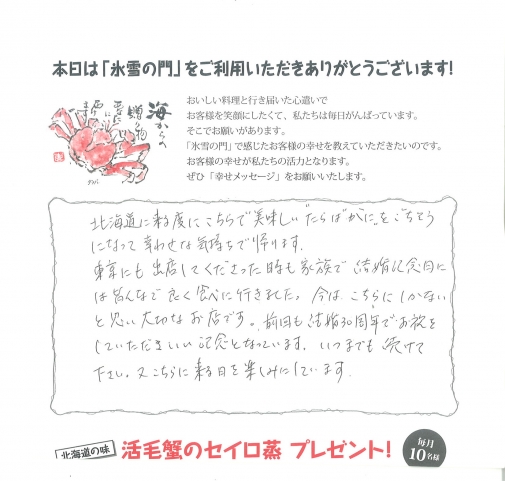 氷雪の門では、ご来店いただいたお客様に「しあわせメッセージ」と称して、お店で感じた「しあわせ」を綴っていただいております。 お客様の幸せは私たちの活力、ここではその一部をご紹介いたします!ご来店の際にはぜひ「しあわせメッセージ」をお願いいたします。